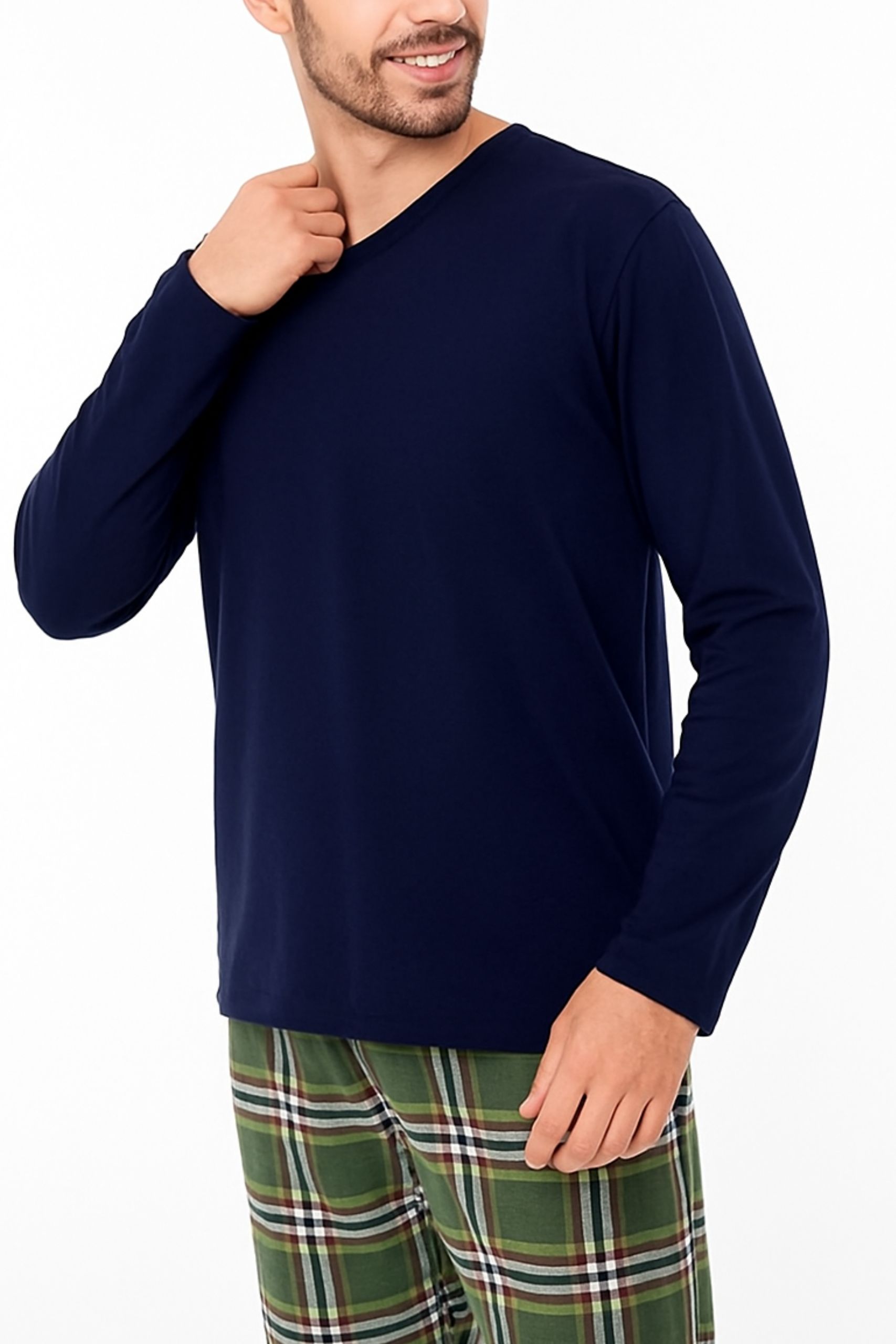 Remera escote en V y pantalón de viyela.