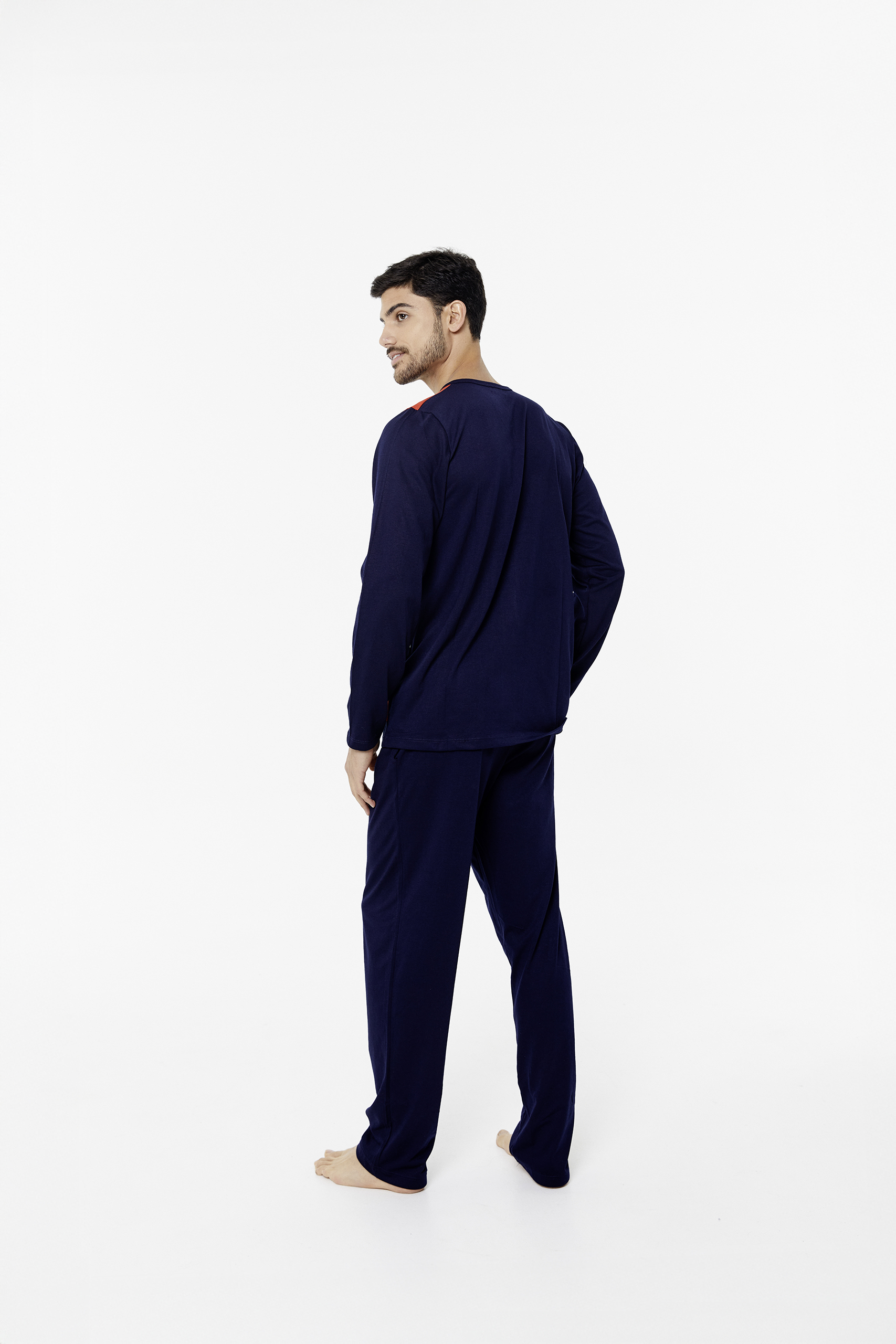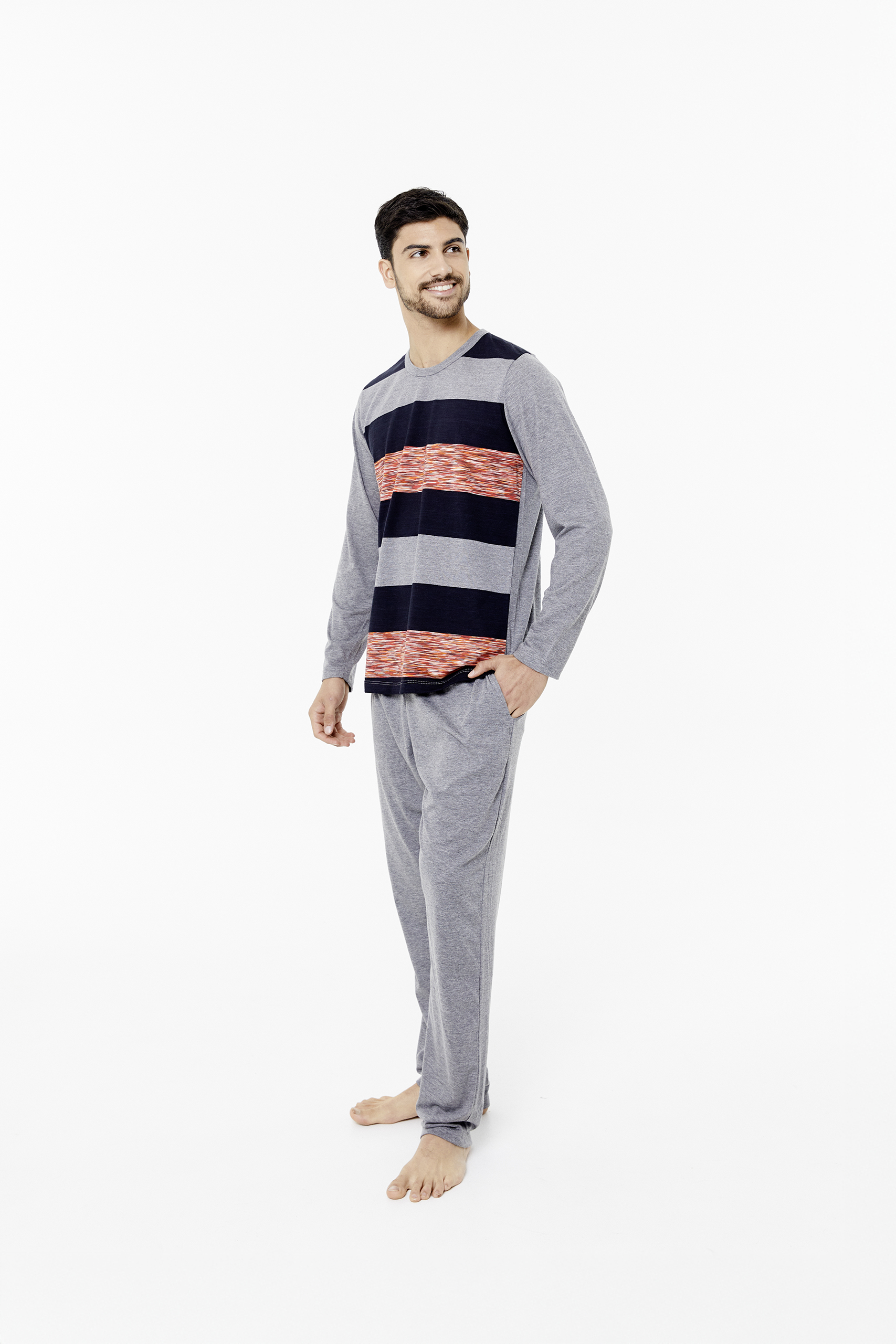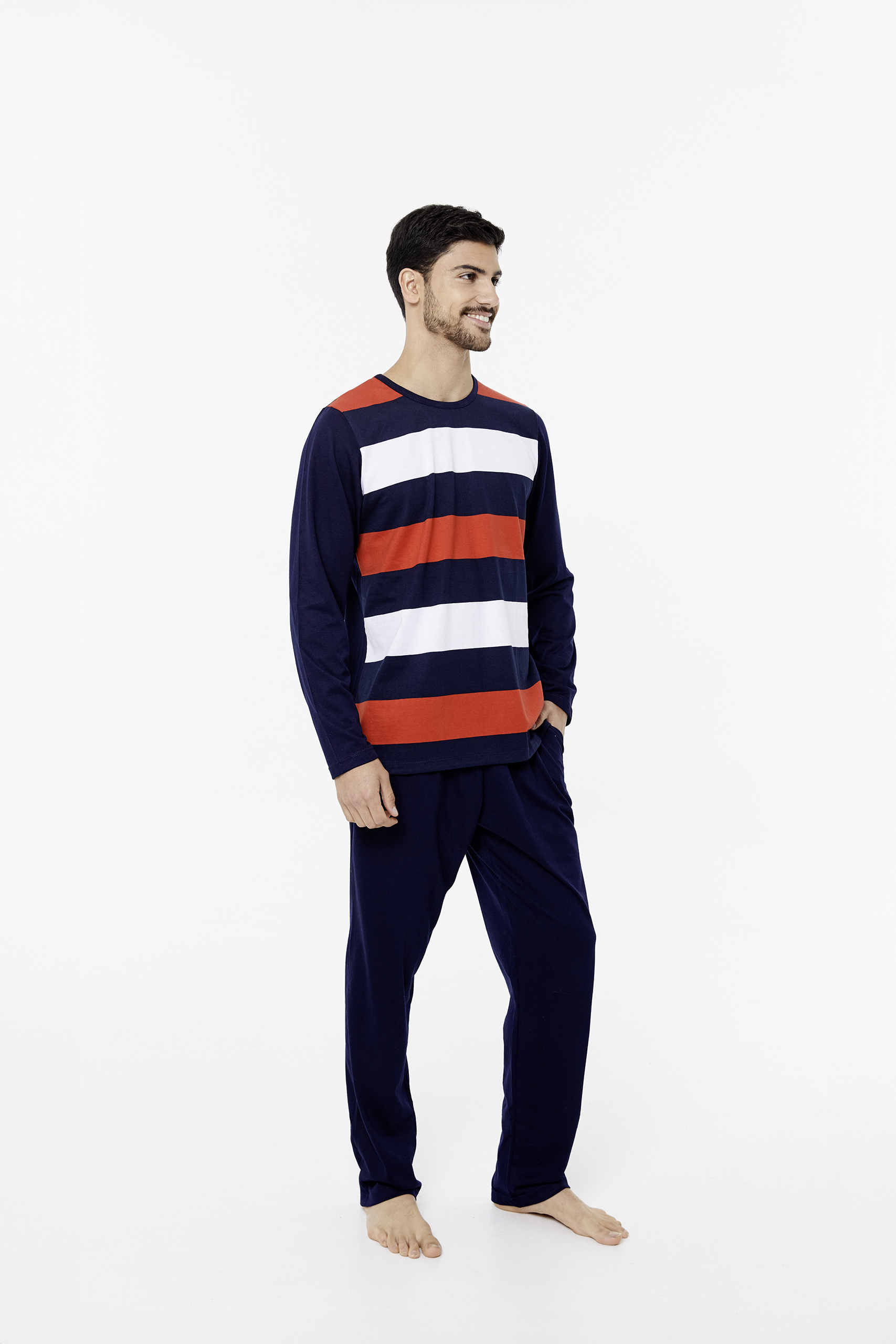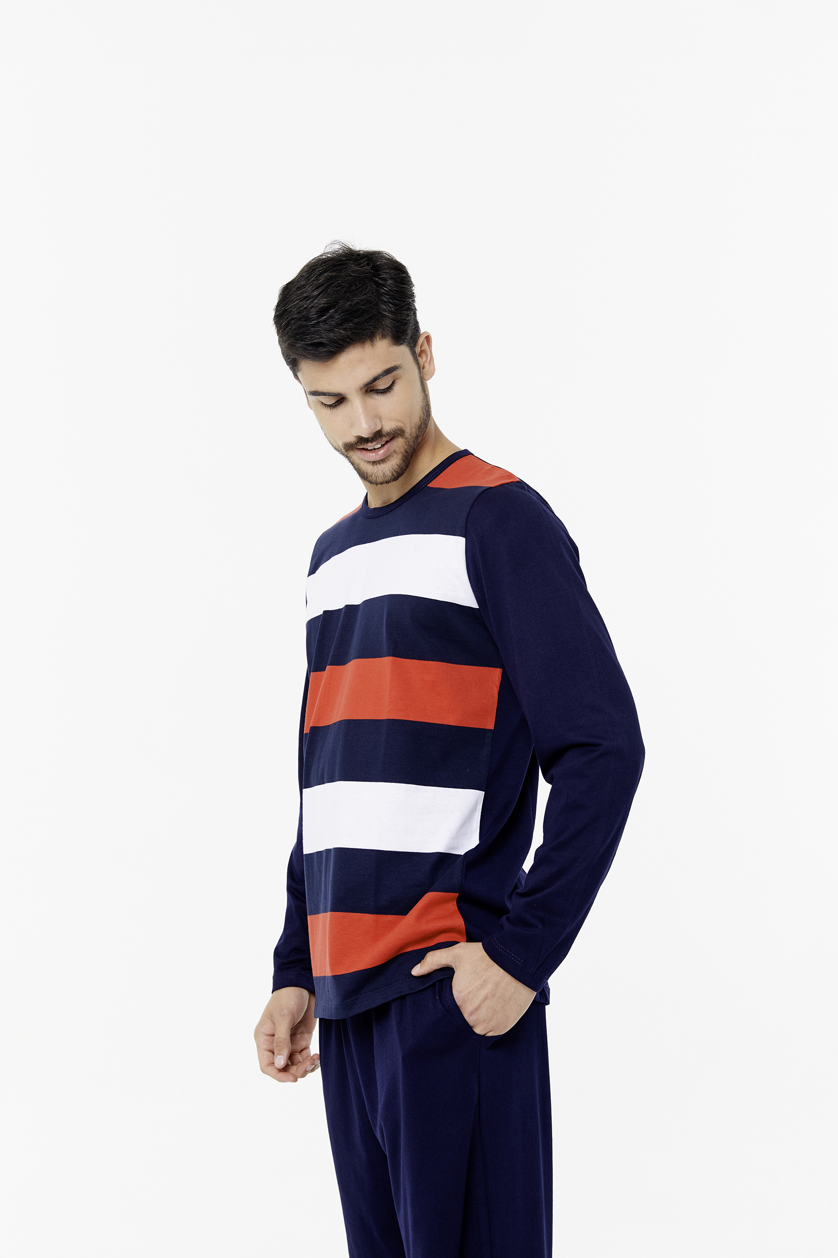 Pijama remera escote redondo, manga larga, rayado + pantalón con bolsillos.